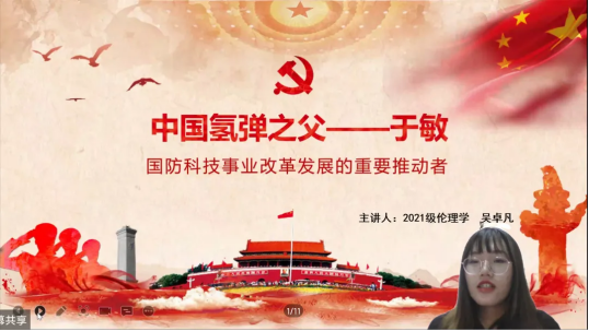 宣讲故事第十八讲,由2021级伦理学专业吴卓凡同学讲述了“中国氢弹之父-于敏”的故事。1961年,于敏开始研究氢弹原理。当时我国完全从一张白纸起步,无数个无名科学家都怀着一颗强烈的爱国心,不分昼夜地坚持着对氢弹的研究。由于长期在艰苦的环境里工作,于敏的身体变得越来越虚弱,曾多次与死神擦肩而过,但于敏却从未停止脚步。终于在1967年6月,我国第一颗氢弹空投爆炸试验成功,中国成为世界上第四个拥有氢弹的国家。从第一颗原子弹爆炸到第一颗氢弹试验成功,美国用了七年多,中国仅仅用了两年零八个月。从内乱外侮的年代走过来,为抵抗新中国面对的核威慑,“普通人”于敏站了出来,和他的同事们一起,以尖端科技铸剑,驱散乌云,护山河太平。正是因为有许多像于敏这样将一生默默奉献给科研事业的人,我们的祖国才会挺起脊梁,日益强大。