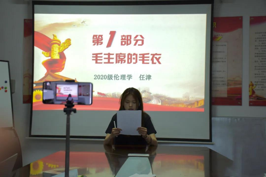 宣讲活动第十讲,由2020级伦理学专业任津同学讲述了“毛主席的毛衣”的故事。1949年10月1日开国大典前,主席午休起来穿的毛衣,两个袖子的胳膊肘处有两个大窟窿是用袜头补上的。主席毛裤的膝盖处也破了两个大窟窿,因为没有合适的袜头就没补上。在下午2点50分,毛主席登上了天安门城楼,庄严地宣布“中华人民共和国成立了”,顿时天安门城下百万人民欢呼如潮。此时,并没有人知道,在这普天同庆的开国大典之日,毛主席穿的是一身破了四个大窟窿的毛衫衣裤。毛主席的勤俭质朴体现在生活的方方面面,无论是在战争时期还是在新中国成立之后,他都始终保持艰苦朴素的优良传统。