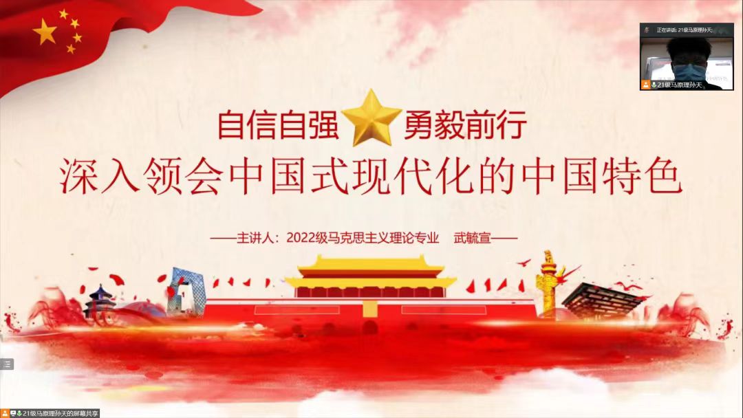 研究生会“悦读二十大,奋进新征程”学习贯彻二十大精神系列活动第一期在二办203举行。系列活动第一期以中国式现代化为主题,共有四位主讲人参与主讲,第三讲主讲人为2022级马克思主义理论专业研究生武毓宣。本活动以线上线下相结合的方式进行,全院90余名研究生参加了此次活动。