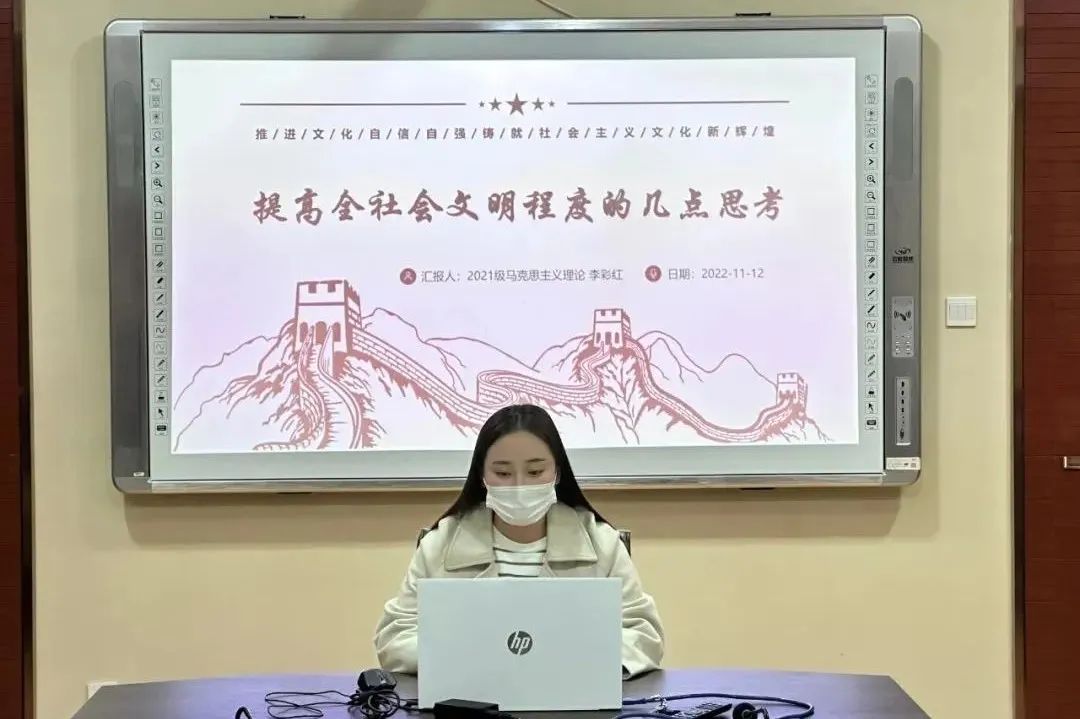 研究生会“悦读二十大,奋进新征程”学习贯彻二十大精神系列活动第二期在二办203举行。系列活动第二期以“推进文化自信自强,铸就社会主义文化新辉煌”为主题,共有四位主讲人参与主讲,第二讲主讲人为2021级马克思主义理论专业研究生李彩红。本次活动采用线上线下相结合的方式,全院90余研究生参加了此次活动。