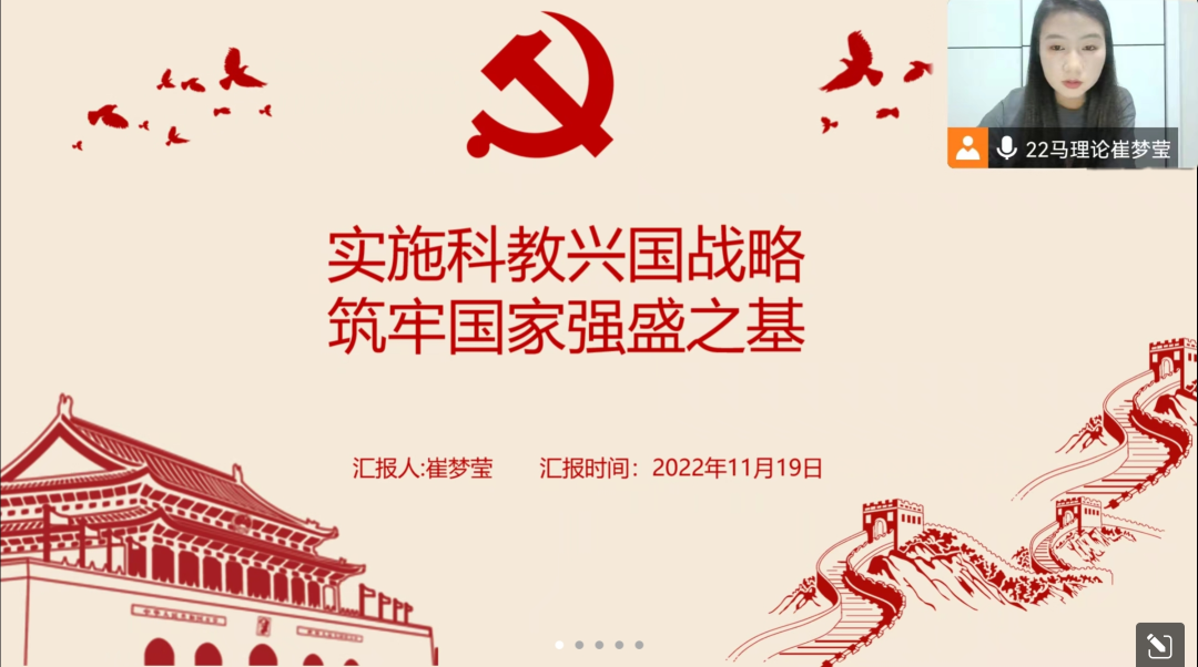 研究生会“悦读二十大,奋进新征程”学习贯彻二十大精神系列活动第三期在线上举行。系列活动第三期以“实施科教兴国战略,强化现代化建设人才支撑”为主题,共有四位主讲人参与主讲,第三讲主讲人为2022级马克思主义理论专业研究生崔梦莹,全院62名研究生参加了此次活动。