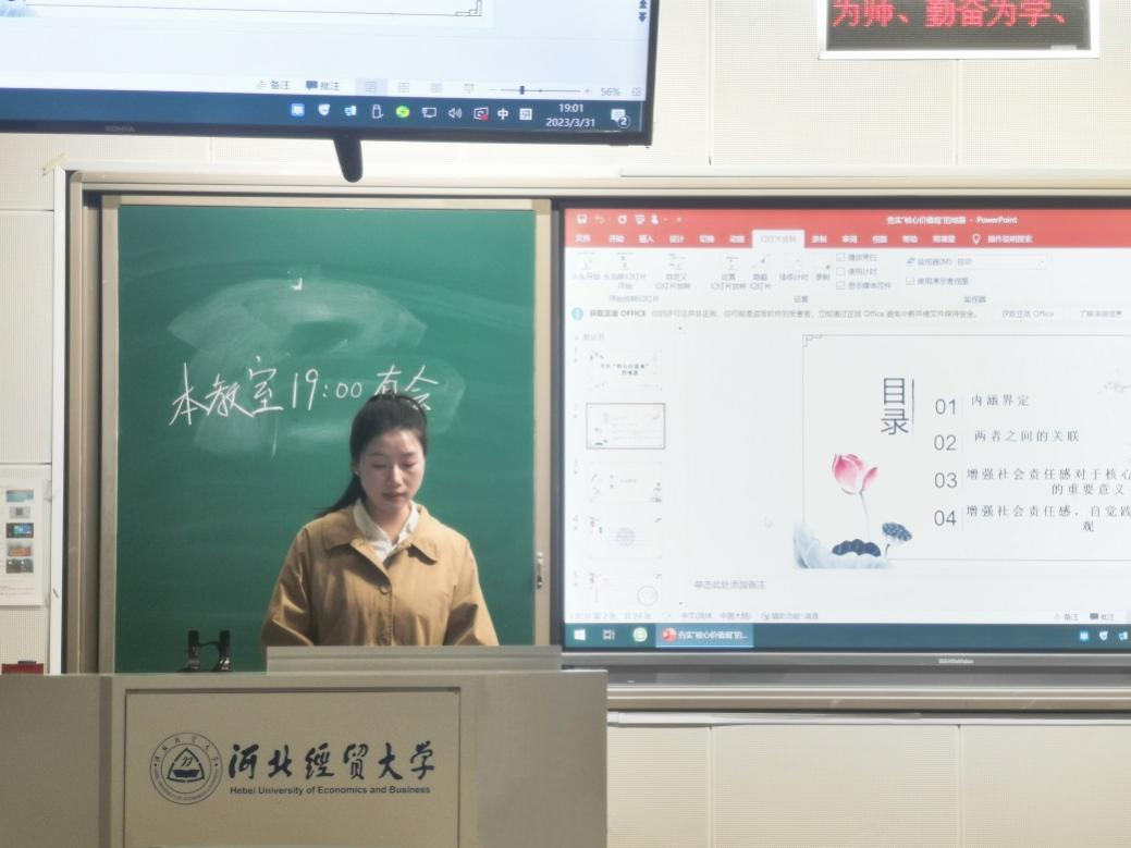 崔梦莹围绕“社会责任感与社会主义核心价值观间的关系”以及“增强社会责任感对于核心价值观践行的重要意义”展开讲述。她谈到,每一个社会成员都是社会环境的主人,其一言一行都影响着社会环境,要使社会环境好,全体社会成员必须高度重视和自觉承担社会责任。如果社会成员普遍缺乏社会责任感,再好的社会理想蓝图也只能是空中楼阁,不可能变成现实。社会责任感在不同社会有不同的内涵,在我国现阶段,其基本内涵就是对核心价值观的自觉践行。每一个社会成员都要自觉主动的践行社会主义核心价值观,以社会主义核心价值观作为衡量是非善恶、正当与否的标准,反思自己的言行,使社会主义核心价值观的要求在全社会落地生根。