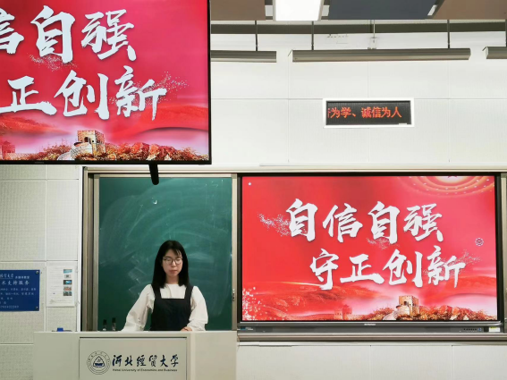 冯圣洁同学主讲的题目为《深刻把握“守正创新”的核心意涵》。她提到,“必须坚持守正创新”是党的二十大报告中提出的“六个必须坚持”中的一项重要内容,是习近平新时代中国特色社会主义思想的世界观和方法论以及贯穿其中的立场观点的重要体现。守正创新紧扣新时代党和国家各项事业发展的新课题,将党的认识和实践活动引向合规律性与目的性的有机统一,充分体现出中国共产党顺应人民求幸福、民族求复兴的要求。新征程上继续推进实践基础上的理论创新,要悟透守正创新的丰富内涵,切实把守正创新的要求落到实处。