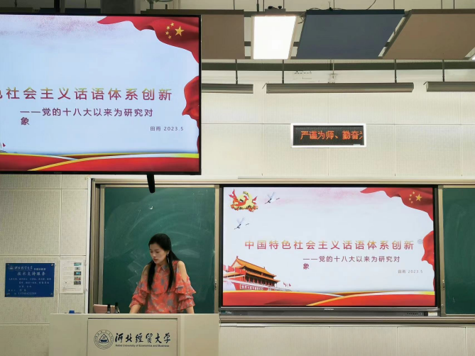 田雨同学主讲的题目为《中国特色社会主义话语体系创新》。该同学指出,中国特色社会主义话语体系是一个综合性的、多层次的话语体系,它融合了中国特色社会主义理论、道路、制度的基本特色,是马克思主义话语体系中国化的理论成果,具有鲜明的时代性、科学性和民族性。她认为在中国特色社会主义话语体系创新的过程中,我们要以回应现实问题为基本导向、以优秀传统文化为驱动力量、以讲好中国故事为目标导向,注重历史使命观的表达、领导核心观的表达、价值立场观的表达、发展战略观的表达、全球治理观的表达。