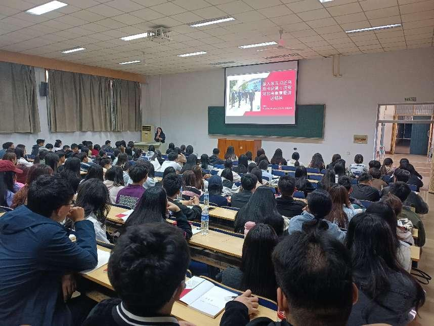 课上,李英以“深入学习习近平总书记第十次到河北考察重要讲话精神”为主题,以马克思主义基本原理、习近平新时代中国特色社会主义思想等科学理论为依据,对京津冀协同发展、雄安新区建设的重要意义、新时代我国自主创新发展进行了深入浅出的讲解,并用学生听得懂、学得会、用得上的知识为在场的同学呈现了一场专业知识理论与实践紧密契合的视听盛宴。