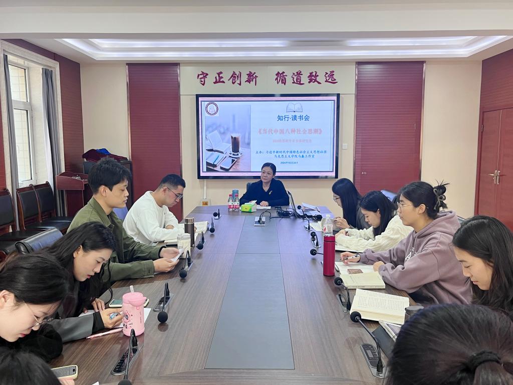 10月24日晚,学院在二办203室举办研究生“知行”读书系列分享会(第一期),会议由习近平新时代中国特色社会主义思想社团、第一党支部马鑫工作室主办。本次读书会聚焦《当代中国八种社会思潮》一书,邀请胡俊苗副教授作为评议人,2024级思想政治教育方向全体研究生参会讨论。