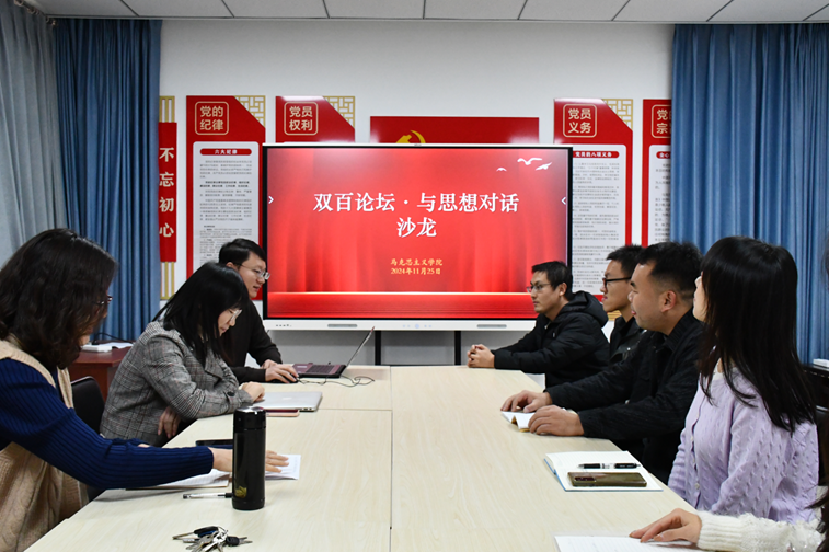 为促进学院教师之间的学术交流,营造浓厚的学术氛围,11月25日下午,学院在一办442举办第四期“双百论坛·与思想对话”学术沙龙。沙龙活动由冉莹雪博士主持,梁若愚博士主讲,与谈人王永男博士、曲波博士以及学院青年教师参加。