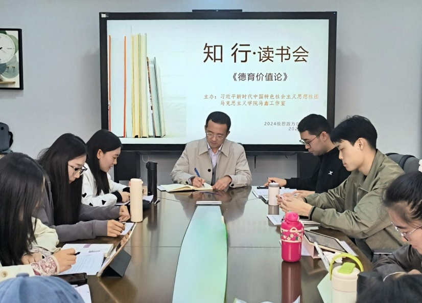 在二办202举办研究生“知行”读书系列分享会(第五期),会议由习近平新时代中国特色社会主义思想社团、第一党支部主办。本次读书会聚焦《德育价值论》一书,邀请马鑫作为评议人,2024级思想政治教育方向全体研究生参会读书会。