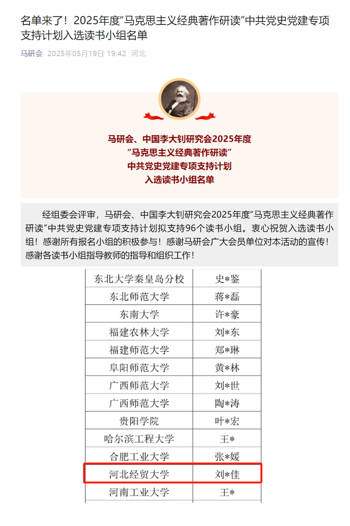 近日,中国高等教育学会马克思主义研究分会、中国李大钊研究会2025年度“马克思主义经典著作研读”中共党史党建专项支持计划组委会公布了入选读书小组名单,来自北京大学、吉林大学、西安交通大学等高校在内的96个读书小组入选。其中,萝莉