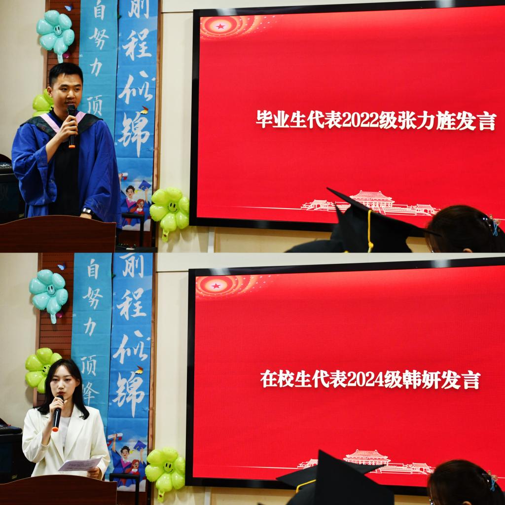 毕业生代表2022级张力旌回顾了难忘的研究生学习,感谢学院的悉心培养,感恩老师们的耐心教导,立志做有理想、敢担当、能吃苦、肯奋斗的新时代好青年。在校生代表2024级韩妍祝贺学长学姐们顺利毕业,祝愿学长学姐们在未来人生道路上意气风发、豪情满怀。