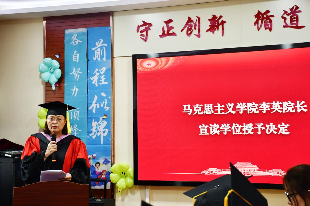 会上,李英宣读学院2025届研究生学位授予名单,代表学院全体教师向毕业生表示热烈祝贺,希望同学们学会做人,坚守责任担当,学会做事,树立明辨思维,在马信马、在马言马,将服务国家、造福人民作为最高追求,成长为有格局、有担当、有温度、值得信赖的人才,在新的人生征程上再创佳绩。