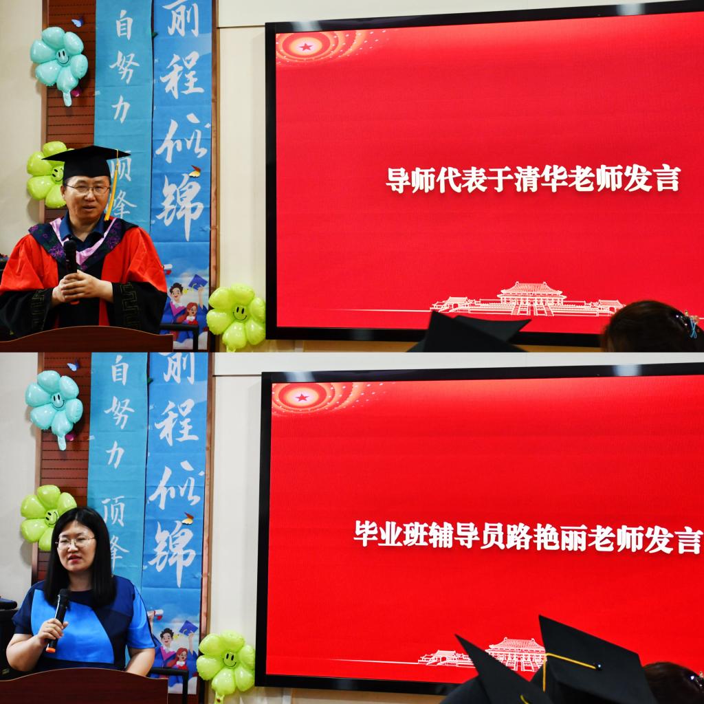 硕士研究生导师代表于清华老师勉励同学们要继续努力、不懈奋斗,祝愿毕业生在未来的学习、工作和生活中前程似锦,蒸蒸日上。毕业班辅导员路艳丽老师感慨与同学们一块学习生活的美好时光,见证了同学们的蜕变成长,希望同学们继续保持昂扬向上的精神状态,富有求新求变的朝气锐气,敢于站在时代前沿,以新的实践创造更大成就,为社会主义现代化强国建设担当作为。