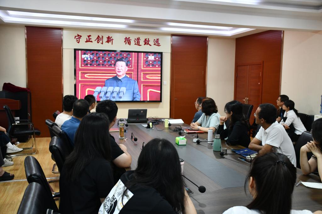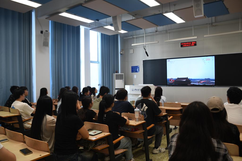 9月3日,纪念中国人民抗日战争暨世界反法西斯战争胜利80周年大会在北京隆重举行。中共中央总书记、国家主席、中央军委主席习近平发表重要讲话并检阅部队。为重温历史荣光、凝聚奋进共识、勇担时代使命,学院组织师生于第二办公楼203会议室集中收看阅兵式直播,学院领导班子成员、行政科室负责人和50余名师生齐聚一堂共同见证这一承载历史记忆、彰显国家力量的庄严时刻。