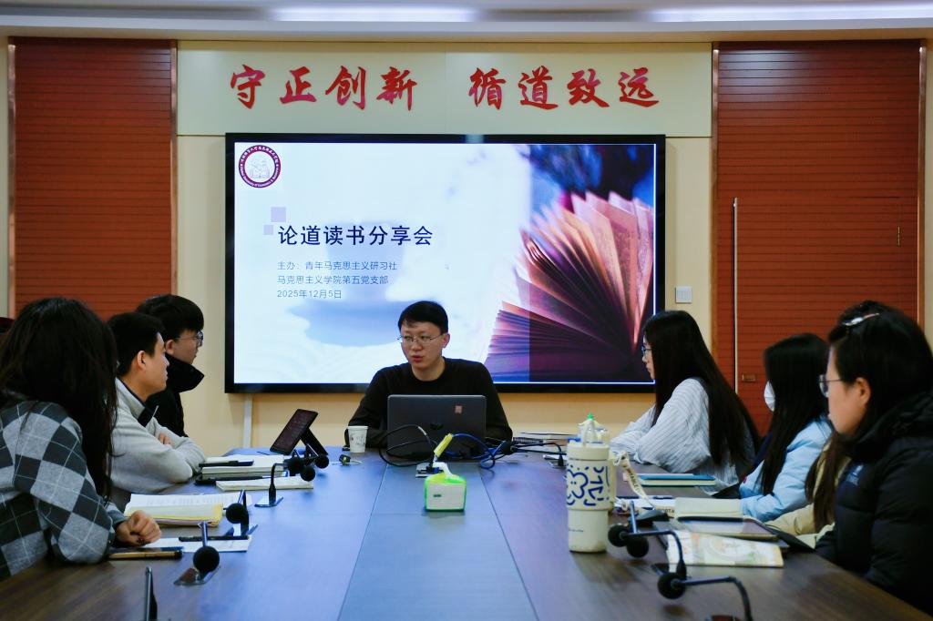 12月5日,学院在二办203举办研究生“论道”读书分享会(第五期),本次会议由青年马克思主义研习社、学院第五党支部主办。学院青年教师、硕士研究生导师梁若愚作为评议人,2025级中国近现代史基本问题研究方向全体研究生参与学习交流。