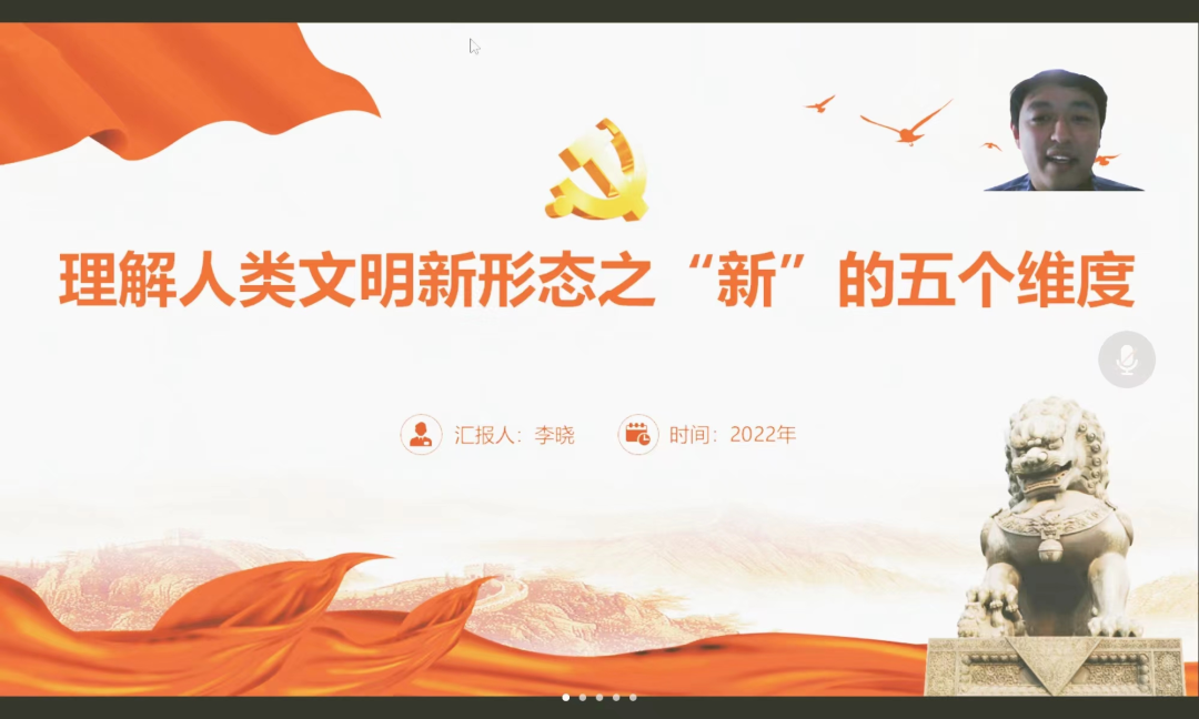 开展了以“理解人类文明新形态之‘新’的五个维度”为主题的宣讲活动。此次宣讲采用线上模式,由纲要教研室党支部书记李晓博士主讲,纲要教研室党支部党员、研究生支部党员、积极分子等五十余人参加会议。