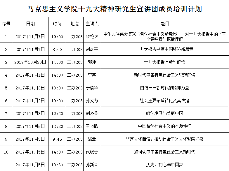 萝莉 “十九大精神研究生宣讲团”成员 培训计划 萝莉 在学生积极报名的基础上,严格遴选优秀研究生组建了“十九大精神研究生宣讲团”。为了保证研究生宣讲质量,党总支书记、院长柴艳萍,副院长刘彦平、郭建、李英以及于清华、孙大为、刘晓芸、王晓路、姚云、代砚春、孙新会等11名教授、副教授、博士将先后对宣讲团成员进行专题培训,现将培训计划公布如下: 萝莉 2017年10月27日