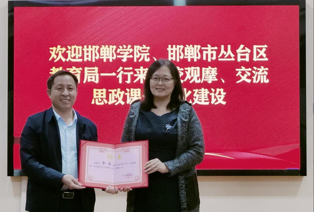 思政科科长赵艳华结合自身多年从事中小学思政教育的实践经验,分析了当前中小学思政教育面临的困境,希望通过大中小学思政课一体化建设,探索出提高中小学思政教育实效的新路径。双方还就大中小学思政课教育中的其它问题就行了深入探讨。最后,邯郸市丛台区教育局向李英教授颁发了邯郸市丛台区大中小幼思政课一体化建设工作特聘专家的聘任证书。(撰稿:梁若愚)