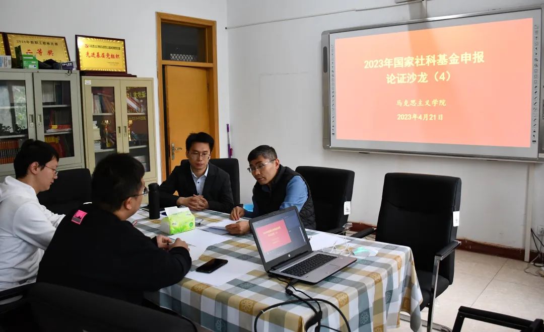 在一办408举办第四期国家社科基金论证沙龙会,郭建教授主持沙龙。蒋志远、路艳丽、梁若愚、黄少雄四位老师参会。